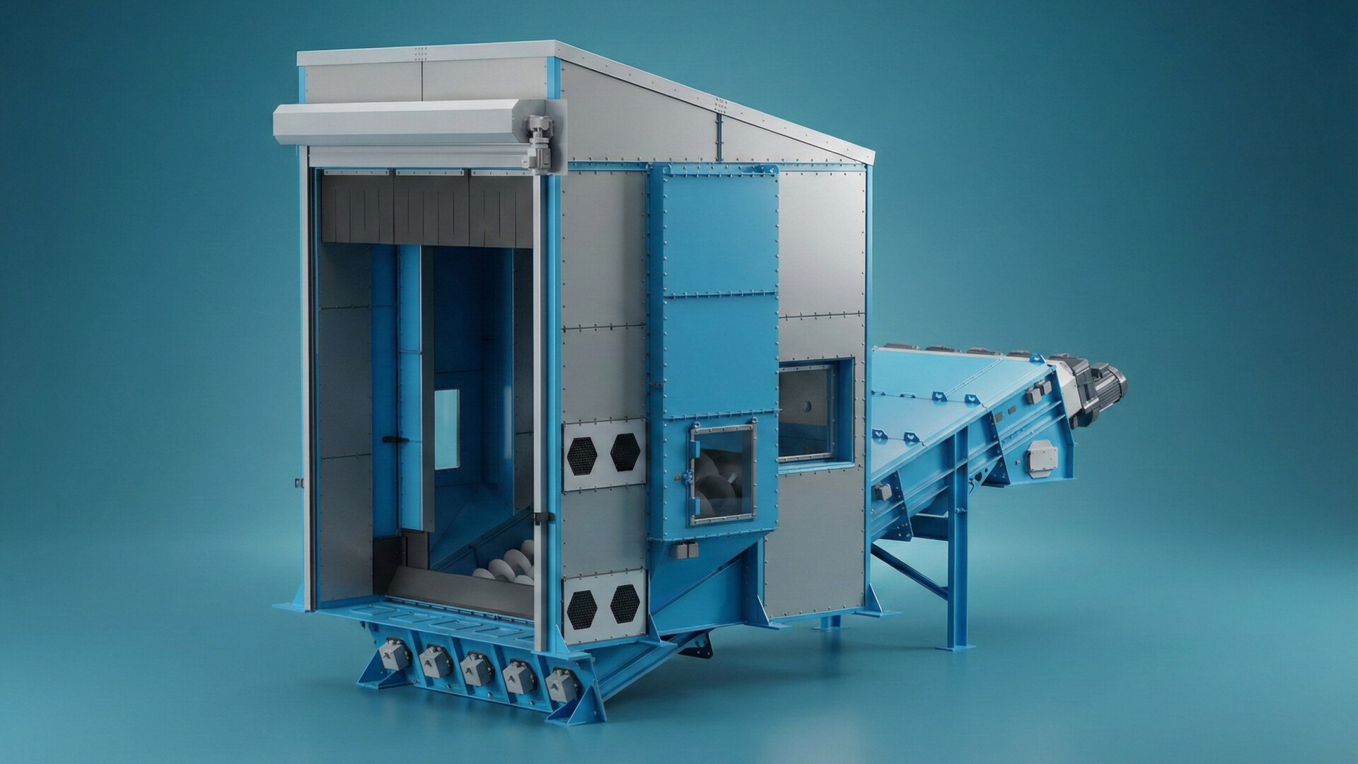 Boční a spodní těsnící klapky jsou ovládány pneumaticky, což umožňuje jejich přesné a spolehlivé přizpůsobení různým typům návěsů. Pro uzavření stanice a ochranu před vnějšími vlivy je zařízení vybaveno automatickými rolovacími vraty, která dále přispívají k omezení prašnosti a zajišťují bezpečný provoz.